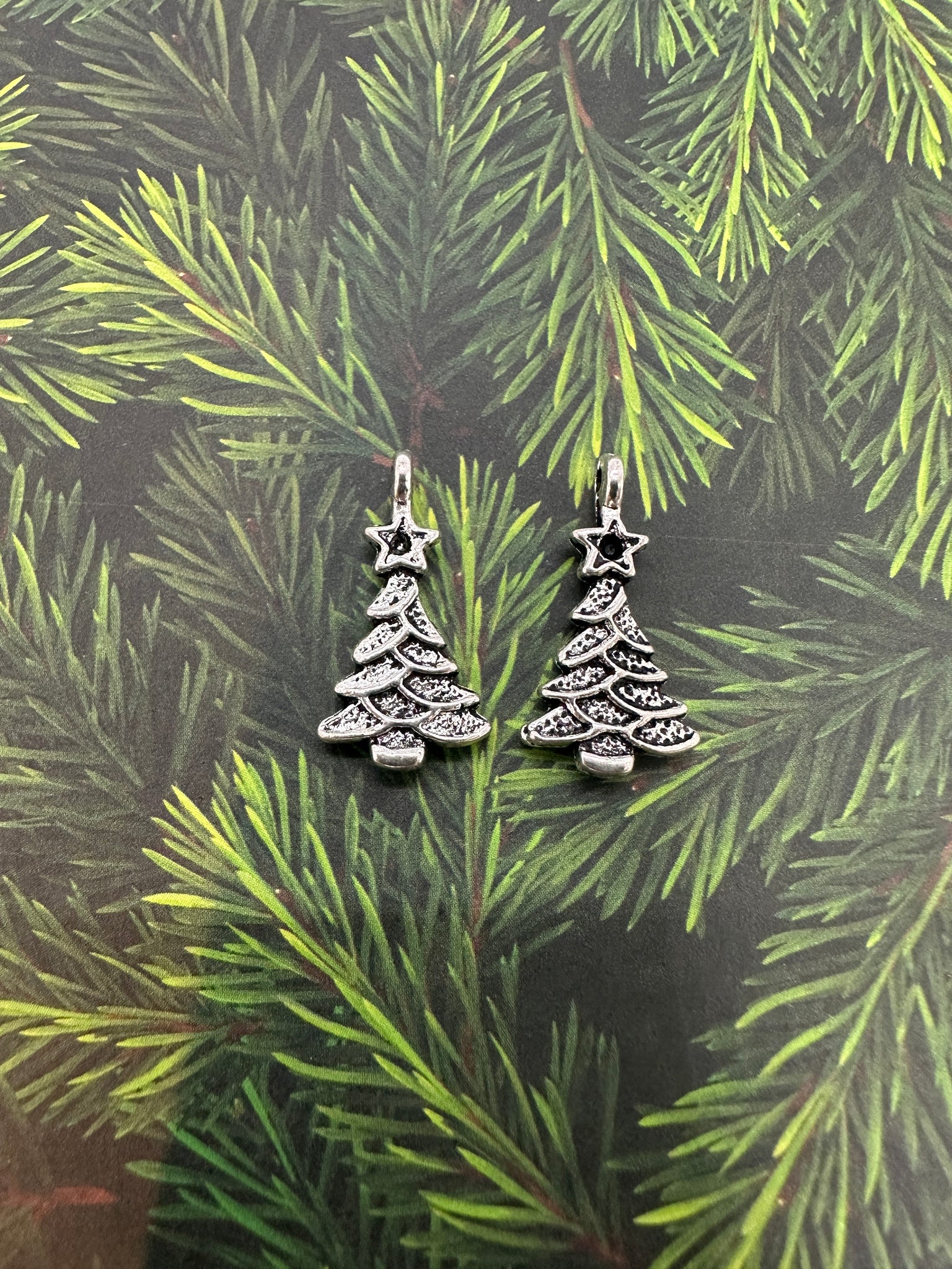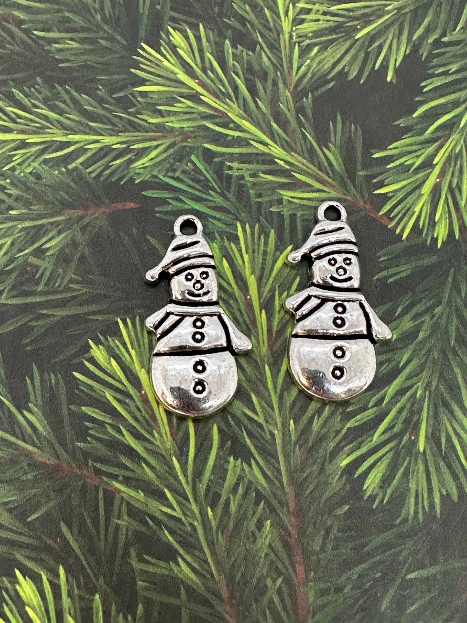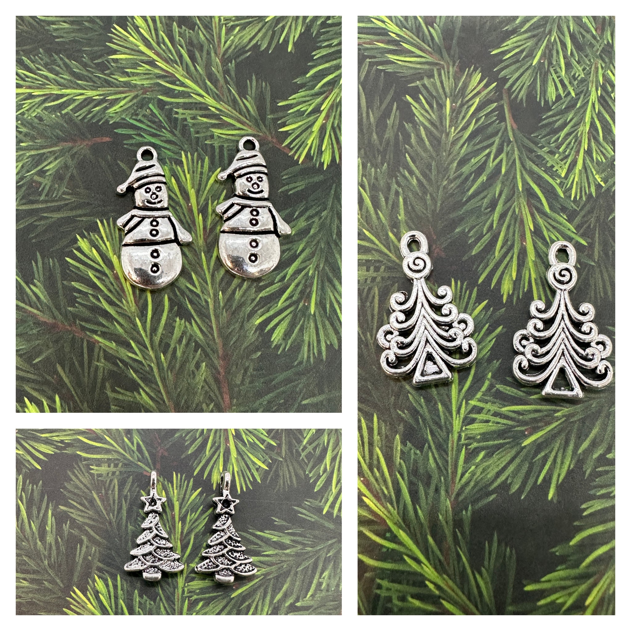 Antique Silver Christmas Charms available in Snowman or two types of Christmas Tree