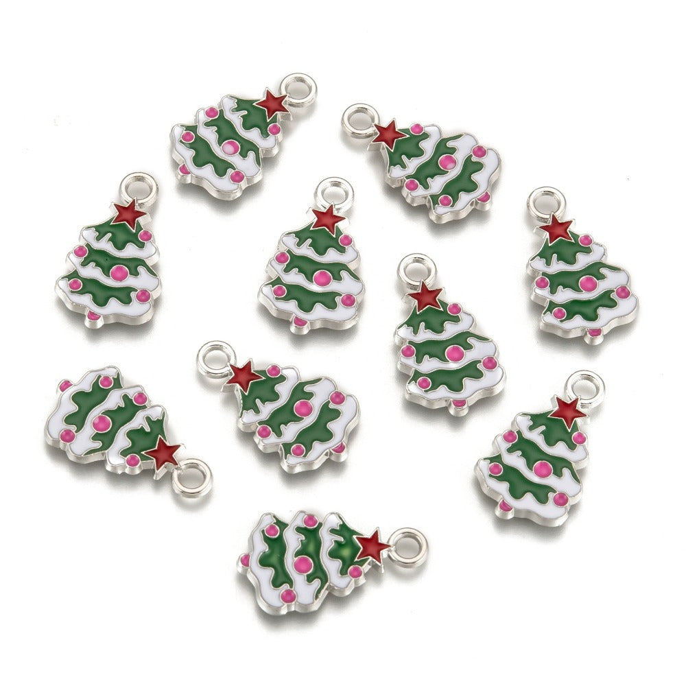 Silver Enamel Christmas Tree Charms 26mm x 15mm with a 3mm Loop